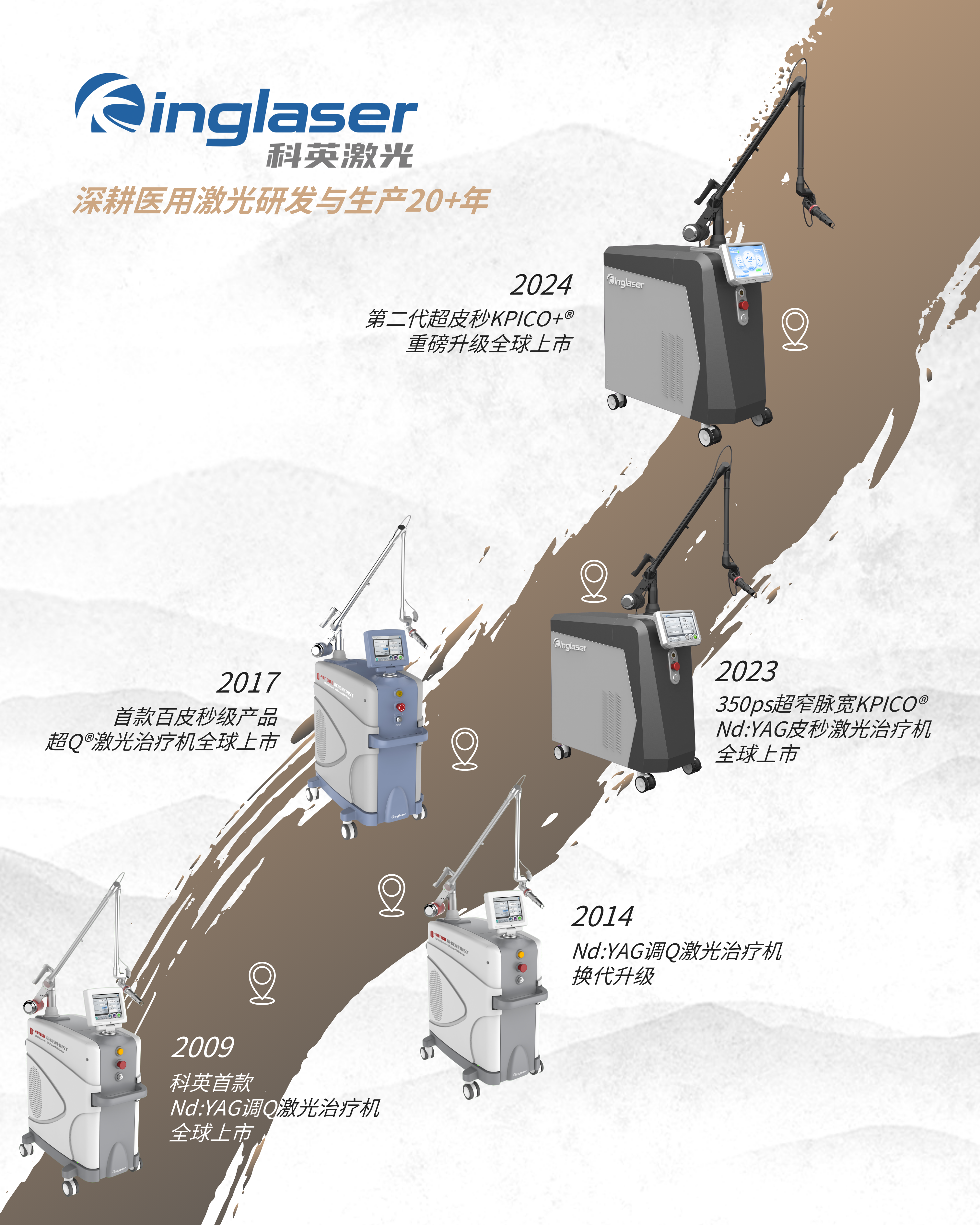 科英激光成立于2003年,二十余年來專注于激光技術在醫(yī)學領域的應用。公司自2009年在全球首次上市Nd:YAG調(diào)Q激光治療機以來,產(chǎn)品不斷升級改進,在2014年迎來升級換代后,又于2017年推出科英首款百皮秒級產(chǎn)品超Q®激光治療機銷往海內(nèi)外,并在2023年成功上市科英首款350ps超窄脈寬KPICO®Nd:YAG皮秒激光治療機。此次完成重大升級的第二代超皮秒KPICO+®,實現(xiàn)了集1064nm、532nm雙波長于一體,在延續(xù)科英相關產(chǎn)品多年積累的技術路線、工藝質(zhì)量控制的基礎上,旨在持續(xù)為國內(nèi)醫(yī)療機構提供適合中國市場的高端醫(yī)療設備。